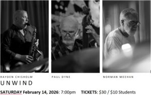 Hayden Chisholm’s saxophone playing is a miracle – and in St. Peter’s Hall he sounds just gorgeous. Performing music that knows a lot about jazz as well as folk and chamber music traditions, his group Unwind play melodic, contrapuntal music with a beautiful group sound and a great deal of space. Hayden – originally from Taranaki but resident in Europe for more than 30 years – leads Unwind with local musicians Paul Dyne (bass) and Norman Meehan (piano).