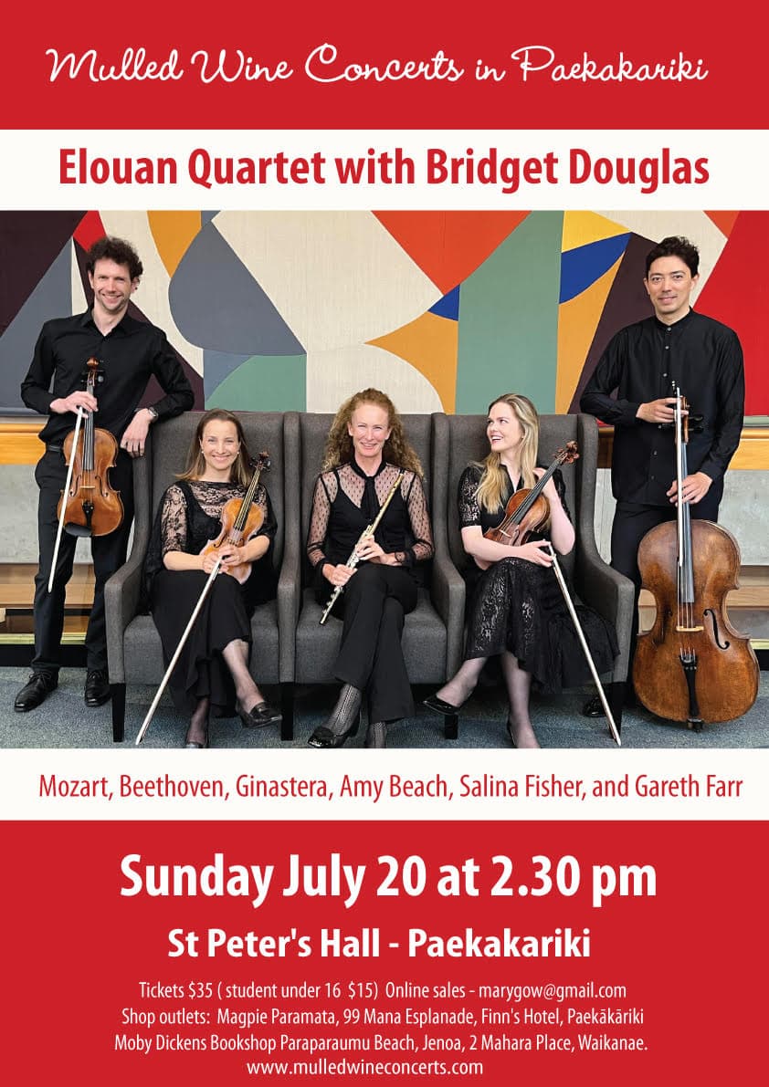 The Elouan Quartet with Bridget Douglas CLASSICAL FLUTE AND STRINGS IN PAEKĀKĀRIKI The Elouan Quartet with Bridget Douglas will present a captivating programme of music for flute and string quartet. Highlights include works by Mozart, Beethoven, Ginastera, Amy Beach, Salina Fisher, and Gareth Farr. These works are paired together in such a way as to […]